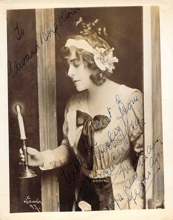 New Zealand-born Australian-raised soprano (1879-1952), famous during the first three decades of the 20th century for her partnerships with Enrico Caruso at The Met Opera. Gorgeous black-and-white photograph signed by her with a short sentiment, shown as Mimí in Puccini's opera La Bohème. Printed signature on front of photographer Mishkin, New York. Size is 8 x 10.1 inches, small creases on corners, (not affecting signature), otherwise in very good condition.