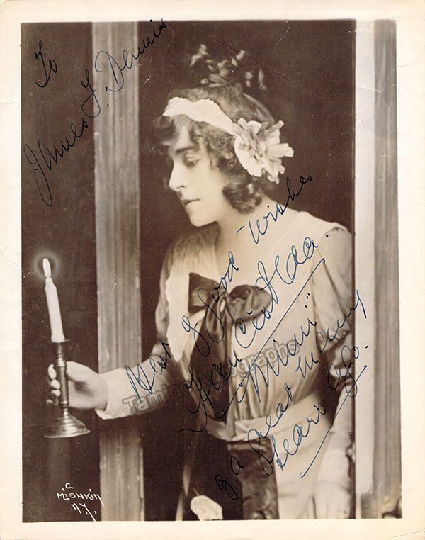 Gorgeous black-and-white photograph signed by her with a short sentiment, shown as Mimí in Puccini's opera La Bohème. Printed signature on front of photographer Mishkin, New York. Size is 8 x 10.1 inches, small creases on corners, (not affecting signature), otherwise in very good condition.