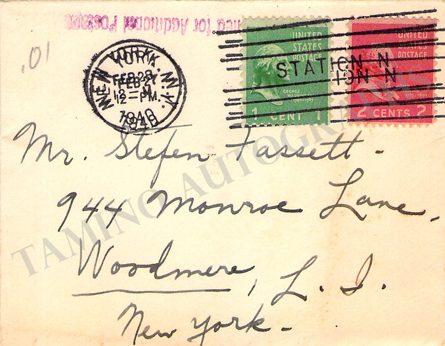 Greeting card with a short note signed by his wife on behalf of the couple. Size is 3.9 x 2.4 inches, in very good condition.