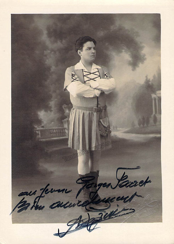 Fine black-and-white photograph signed and inscribed by him with a short sentiment, shown as Arnold in Rossini's opera Guillaume Tell; blind-stamped on the front by M. Eck (Argel). Size is 5 x 6.8 inches, in excellent condition.