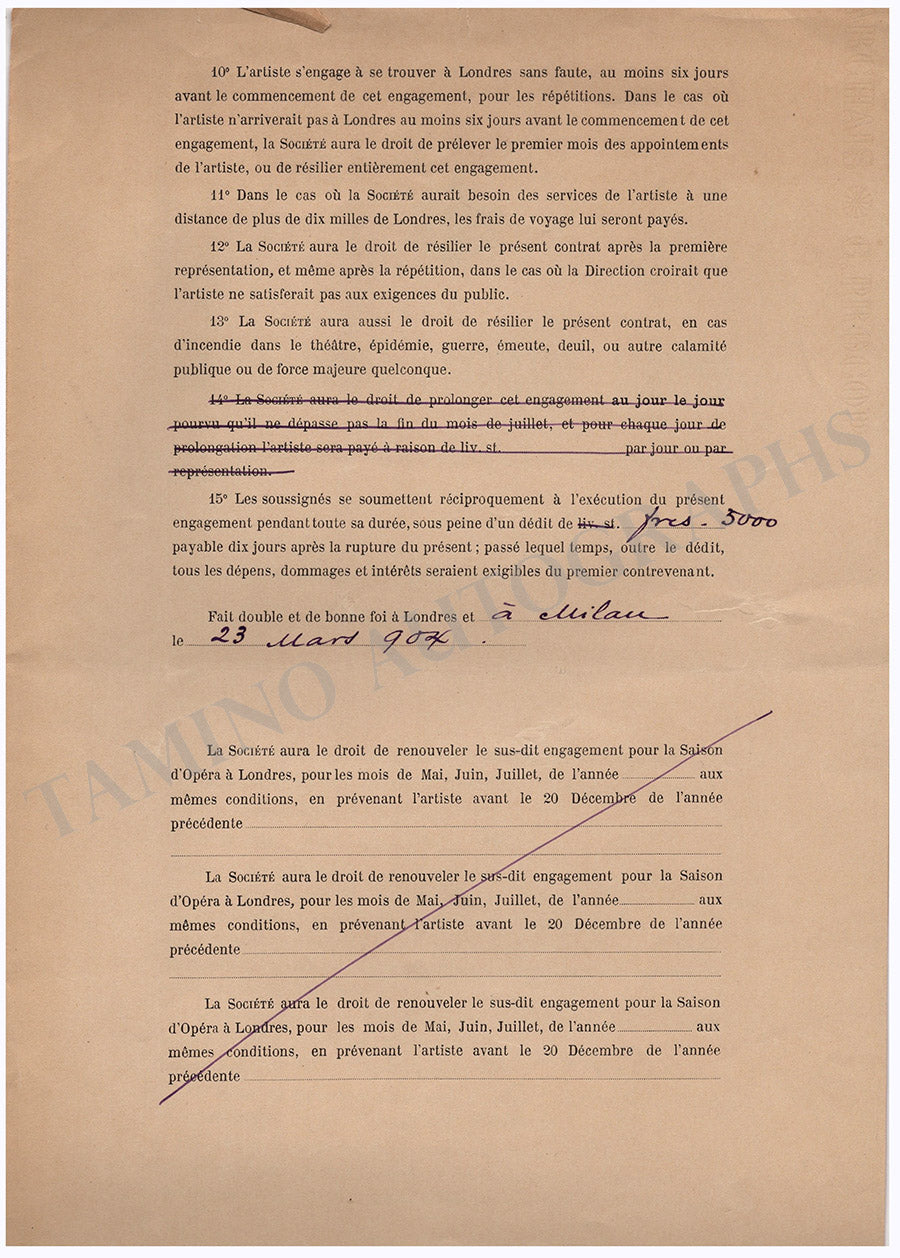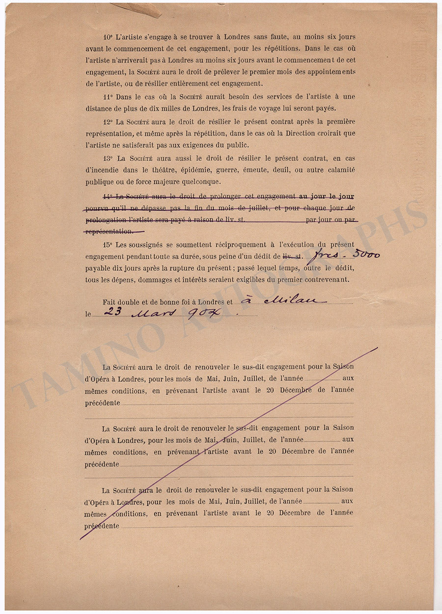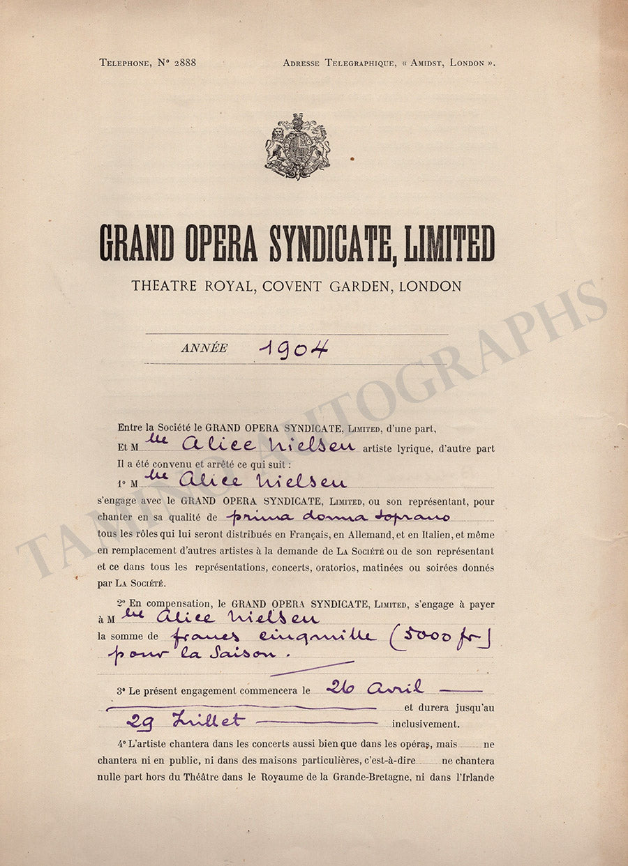 Set of two printed contracts completed by hand for the 1904 season at the Theatre Royal in Covent Garden, specifying repertoire and fees. Size is 8.4 x 11.6 inches each, different lengths, in very good condition.