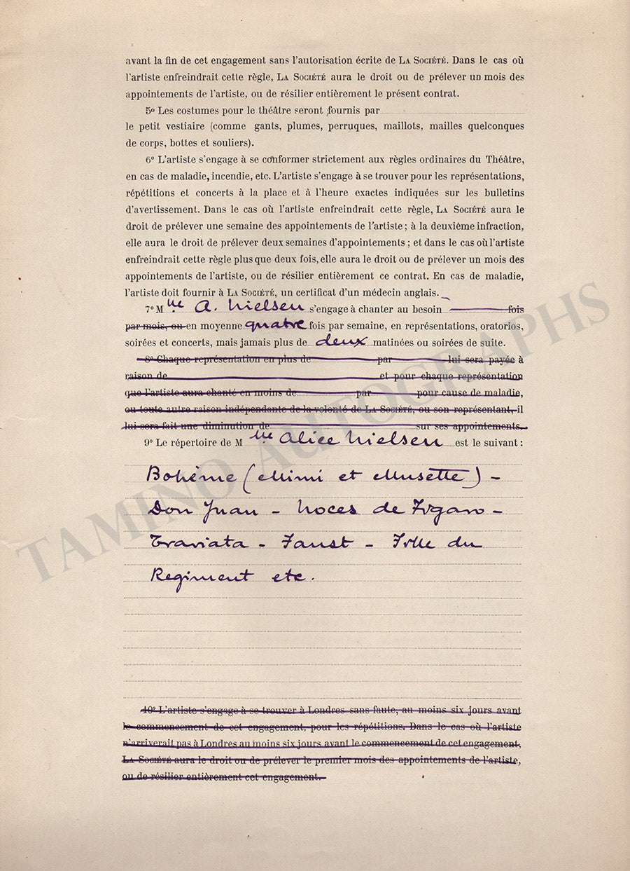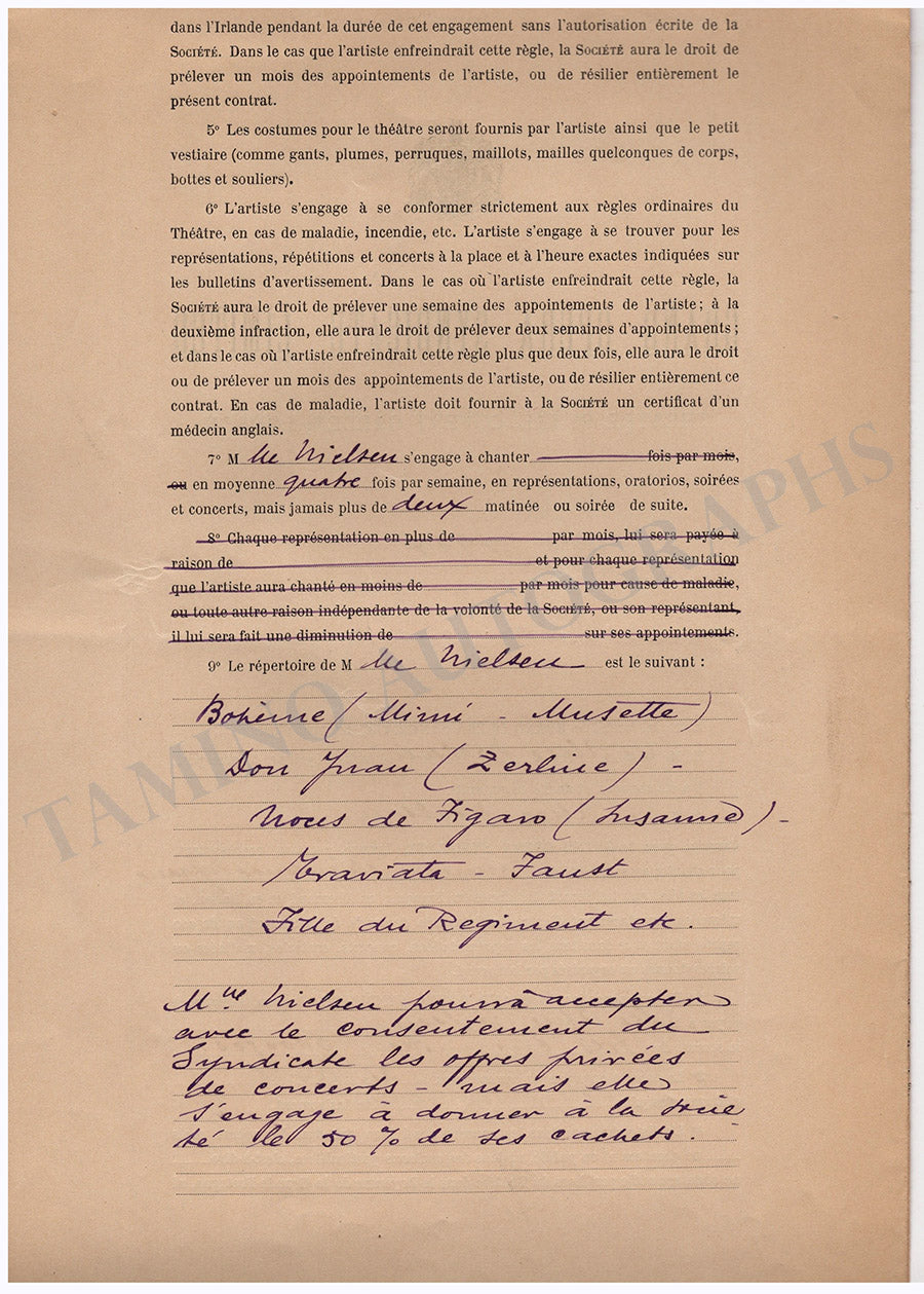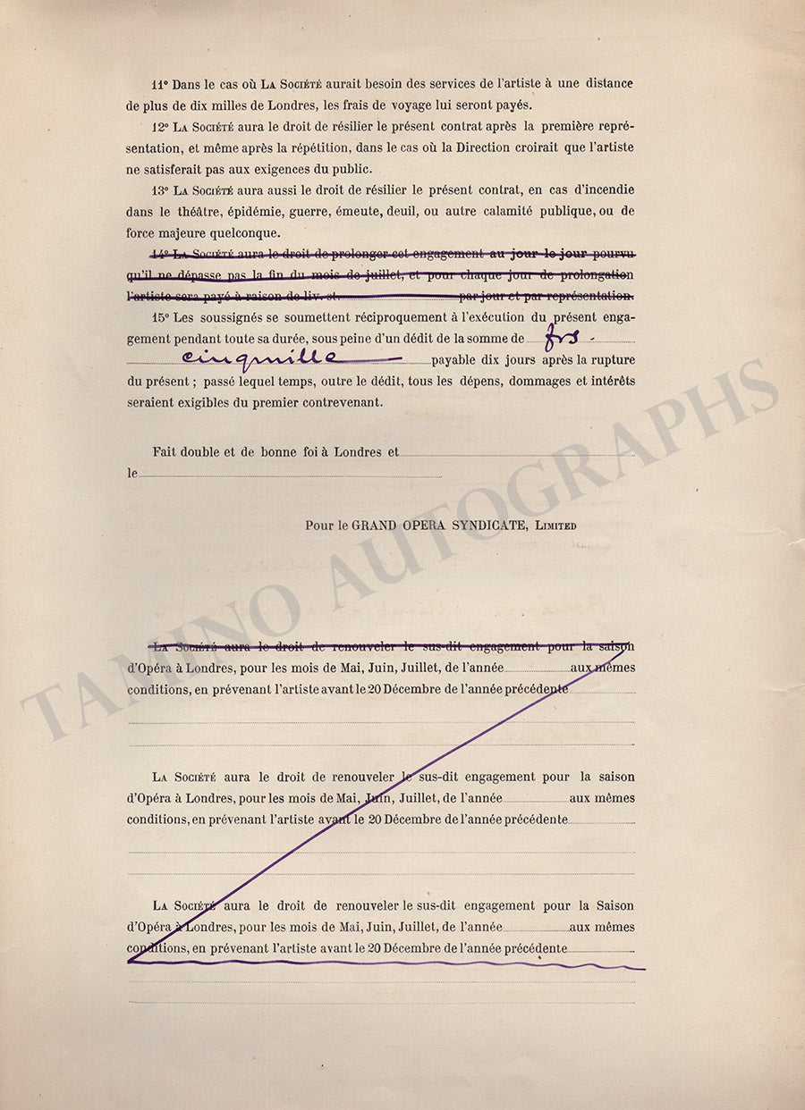 Set of two printed contracts completed by hand for the 1904 season at the Theatre Royal in Covent Garden, specifying repertoire and fees. Size is 8.4 x 11.6 inches each, different lengths, in very good condition.