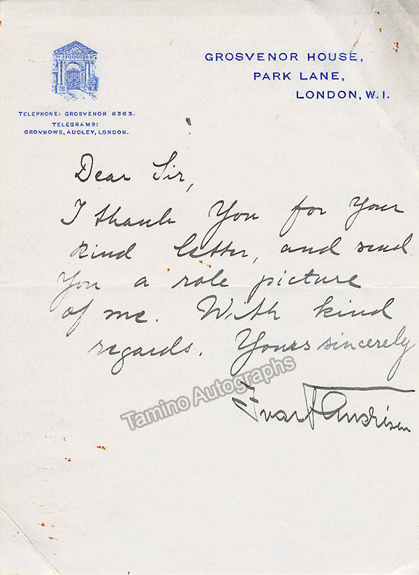 Norwegian bass (1896-1940), who had an active international career and was especially known for Mozart and Wagnerian roles. Autograph note signed, on the stationary of the Grosvenor House in London, size is 5.25 x 7 inches, small creases on top right and bottom left, otherwise in very good condition.
