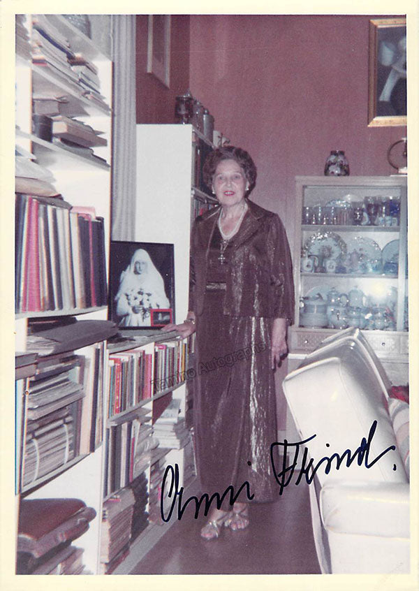 Fine informal color photo signed by her with a short sentiment on verso (not shown), shown in her elder years. Size is 5 x 6.9 inches, in very good condition.