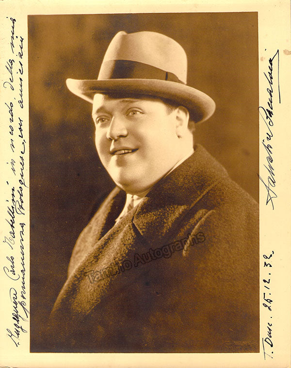 Signed photograph, shown in the title role of Verdi's Falstaff, inscribed. Stamped on verso by photographer R. Strohmeyer. Size is 8 x 10 inches, small creases on edges and mounting traces on verso, otherwise in very good condition.