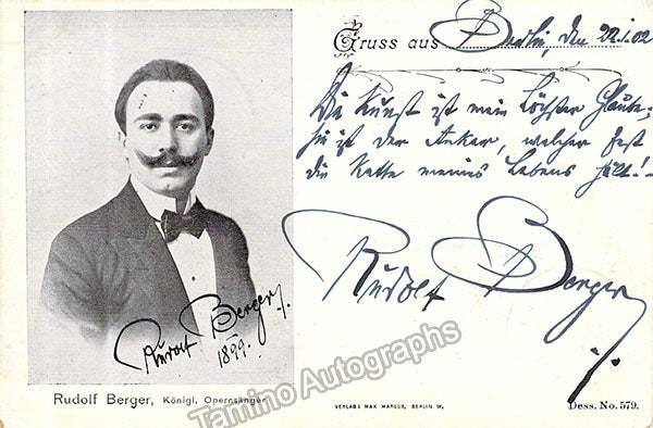German tenor (1874-1915), signed postcard photograph, shown as himself, inscribed and dated in Berlin in 1902. (also contains a facsimile signature on the image, dated in 1899). Photo by Max Marcus, Berlin. Size is 3.5 x 5.5 inches, some wear at various edges but otherwise in excellent condition.