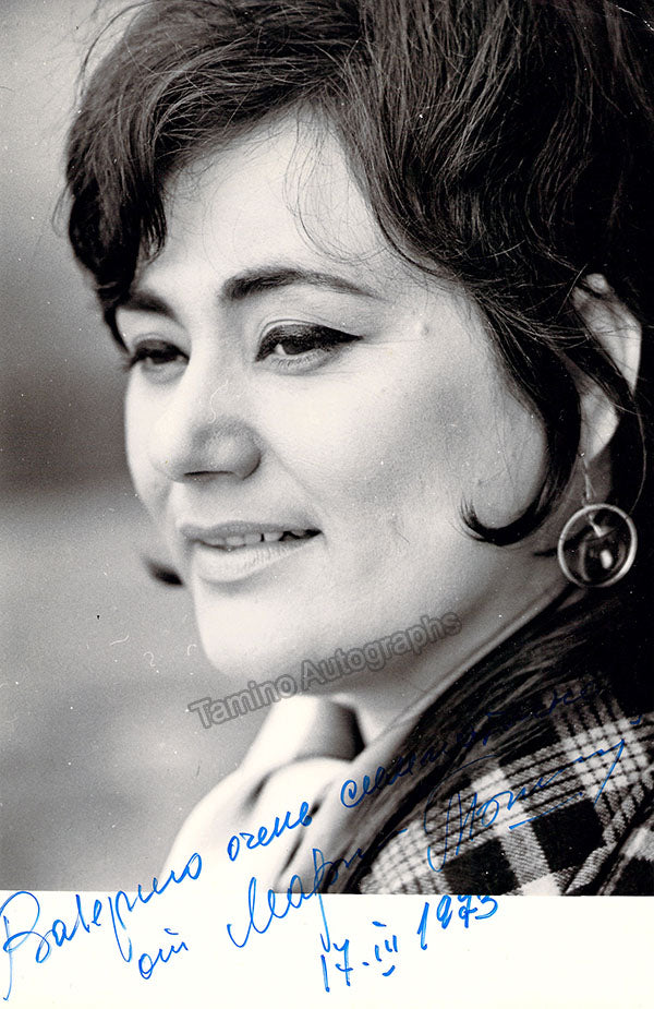 Moldovan soprano (1935-2012), signed photograph, shown as herself, dated in 1973. Signature on verso. Size is 6.25 x 9.25 inches, in excellent condition.