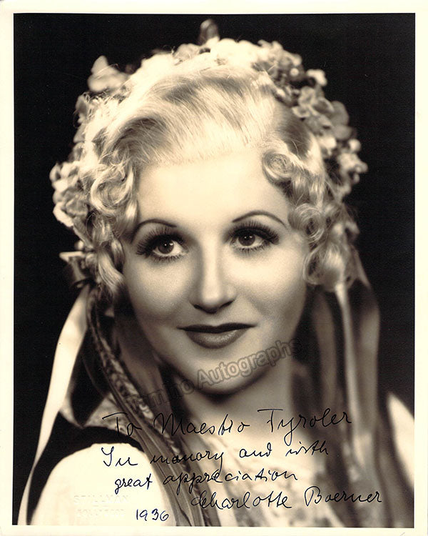 German soprano (1900-?), signed photograph, shown in role, inscribed, dated in 1936. Blind stamped on front by photographer Stillman, Hollywood. Size is 8 x 10 inches, in very good condition.