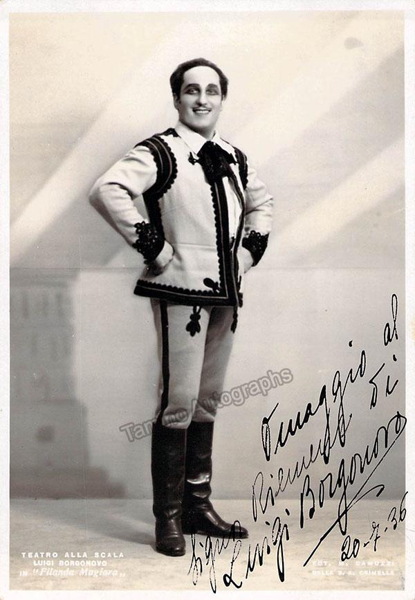 Signed postcard photograph, shown in role in Rinaldo Kufferle's translation (entitled 'Filanda Magiara') of Zoltan Kodaly's opera Székelyfonó. Inscribed and dated in 1936. Photograph by M. Camuzzi, La Scala, Milan. Size is 4 x 5.75 inches, in excellent condition.