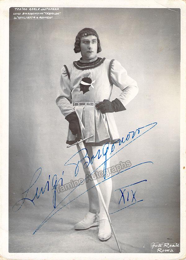 Signed photograph, shown as Tebaldo in Gounod's Romeo et Juliette at the Teatro Reale dell'Opera, Rome. Photo by Foto Reale, Rome Size is 5 x 7 inches, some wear on edges but otherwise in very good condition.