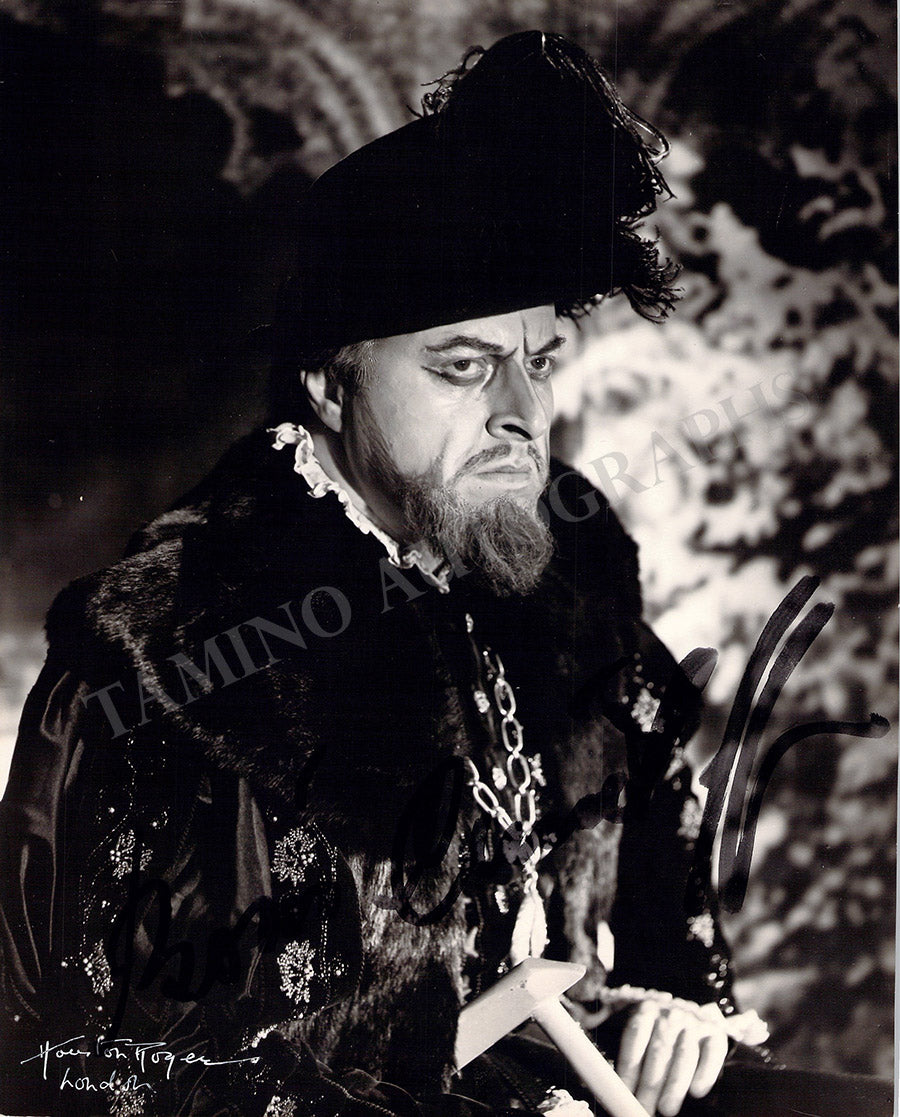 Fine black-and-white photograph signed by him, shown as Filippo II in Verdi's opera "Don Carlo". Size is 8 x 9.9 inches, signed on the front by photographer Houston Rogers (London) and ink-stamped on verso as well, in excellent condition.