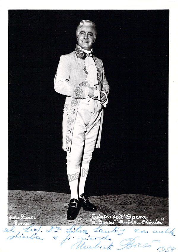 Signed photograph, shown in the title role of Giordano's Andrea Chenier at the Teatro Dell Opera, Rome. Inscribed with sentiment and dated in 1958. Photo by Foto Reale, Rome. Size is 5.1 x 7.1 inches, in very good condition.