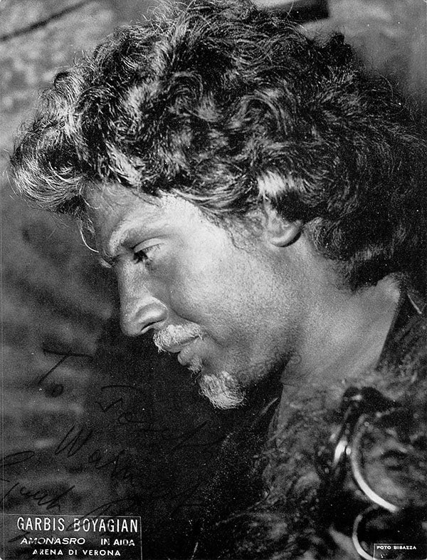 Signed photograph, shown as Amonasro in Verdi's Aida, inscribed. Photo by Bisazza photo studio. Size is 5.5 x 7.25 inches, in excellent condition.