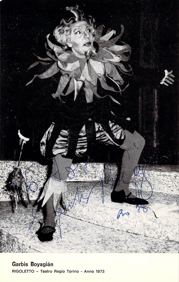 Signed photograph, shown in the title role of Verdi's Rigoletto, inscribed and dated in 1978. Size is 4.25 x 6.75 inches, in excellent condition.
