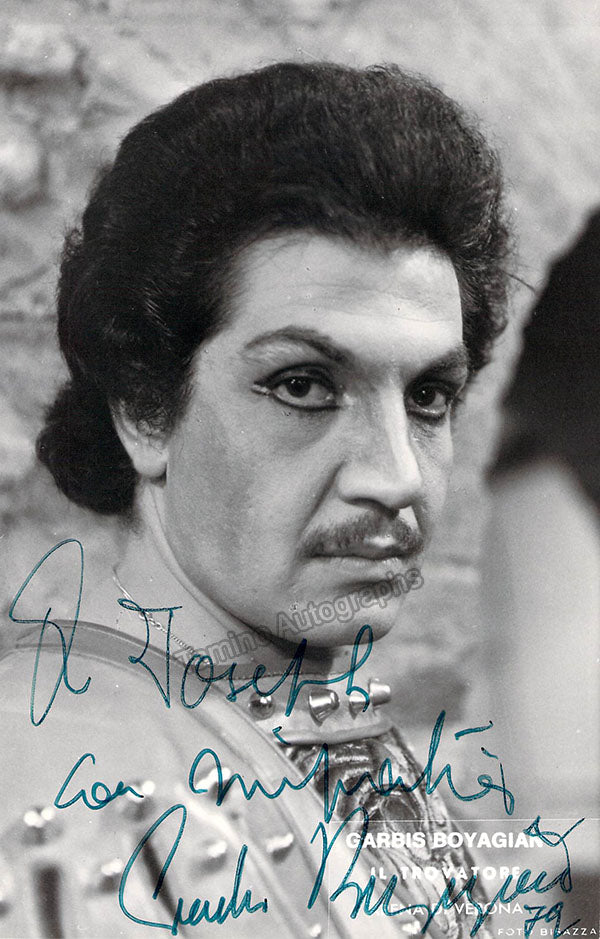 Signed photograph, shown as Germont in Verdi's La Traviata, inscribed and dated in 1978. Stamped on verso by photographer Troncone, Naples. Size is 4.5 x 7 inches, in excellent condition.