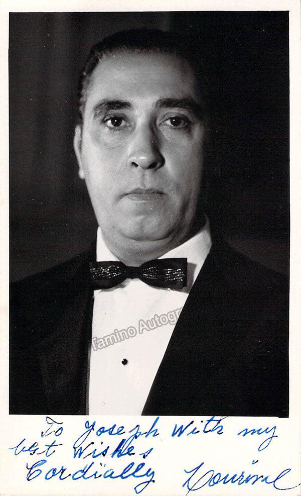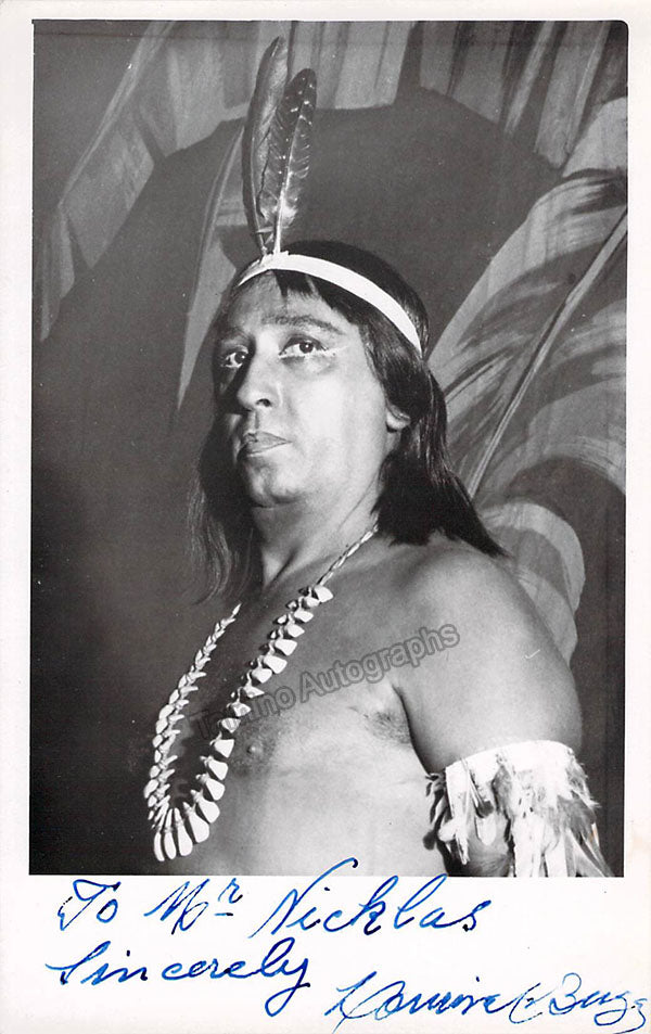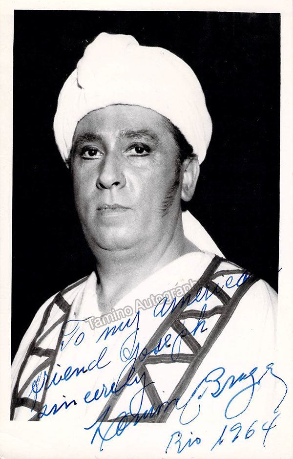 Signed photograph, shown as Cambro in Carlos Gomes' Fosca, inscribed and dated in Rio de Janeiro in 1964. Size is 3.5 x 5.5 inches, in excellent condition.
