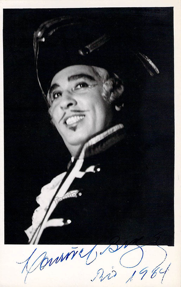 Signed photograph, shown as Don Carlo in Verdi's La Forza del Destino, dated in Rio de Janeiro in 1964. Size is 3.5 x 5.5 inches, in excellent condition.