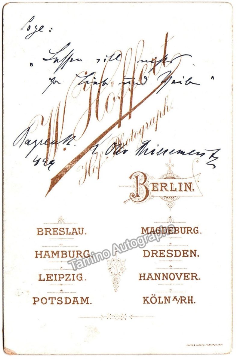 Signed cabinet photo, shown in role at Bayreuther Festival, inscribed and dated in 1899. Photograph by W. Höffert, Berlin. Signed on verso with text quote of Rheingold: "Lassen will nicht von Lieb und Weib". Size is 4.25 x 6.5 inches, in very good condition.