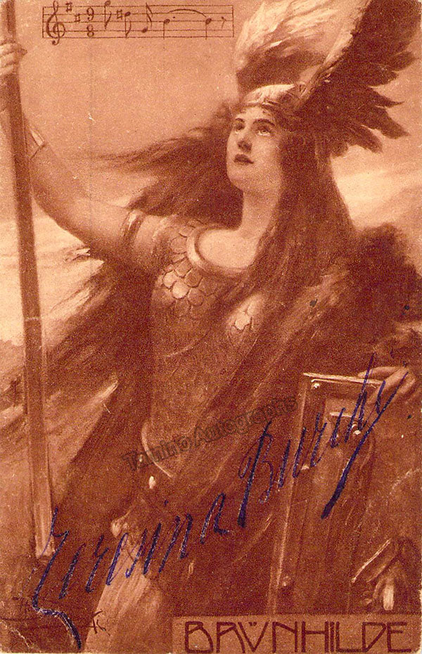 Italian soprano (1877-1963), signed postcard photograph, shown as Brunnhilde in Wagner's Die Walkure, with musical quote above the image. Size is 3.5 x 5.25 inches, very small crease on bottom left, otherwise in excellent condition.