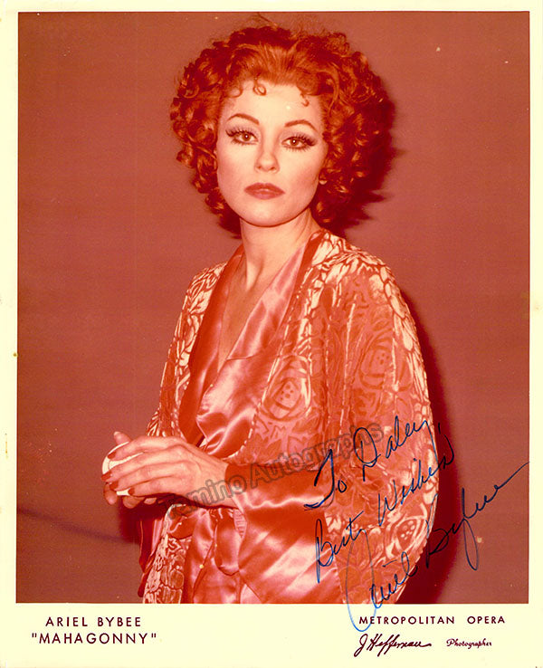 American mezzo-soprano (1943-2018) who sang at the Metropolitan Opera for 18 seasons, signed and inscribed photograph, shown as Jenny the whore in that company's production of Kurt Weill's Mahagonny. Photo by James Heffernan, Met Opera. Size is 8 x 10 inches, mounting tape traces on verso, otherwise in very good condition.