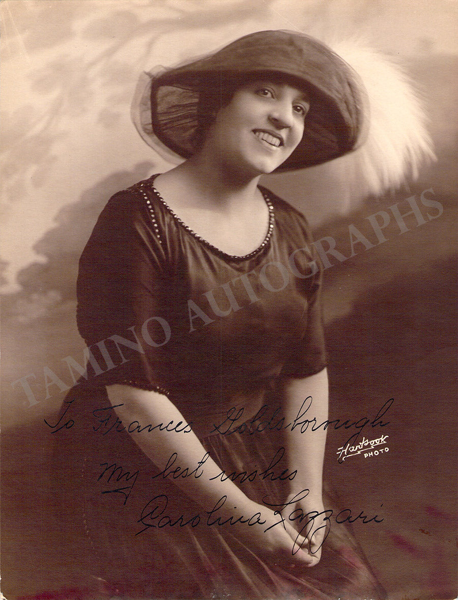 Sepia photograph of her by photographer Hartsook (S.F. Los Angeles) signed and inscribed by Lazzari with a short sentiment. Size is 7 x  9.1 inches, minor water stains over the bottom, otherwise in very good condition.