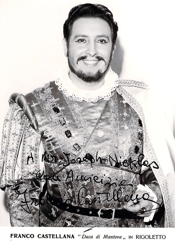 Italian tenor, active in the 1960s both in main roles and as a leading comprimario tenor at La Scala beginning in 1971. Signed photograph, shown as the Duke in Verdi's Rigoletto, inscribed. Size is 4.25 x 5.75 inches, in excellent condition.