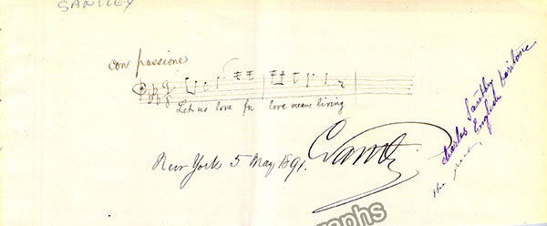 ALSO INCLUDED is an autograph music quote written on a 3.5 x 8.25 inches album page, signed by him in New York,1891, in excellent condition.