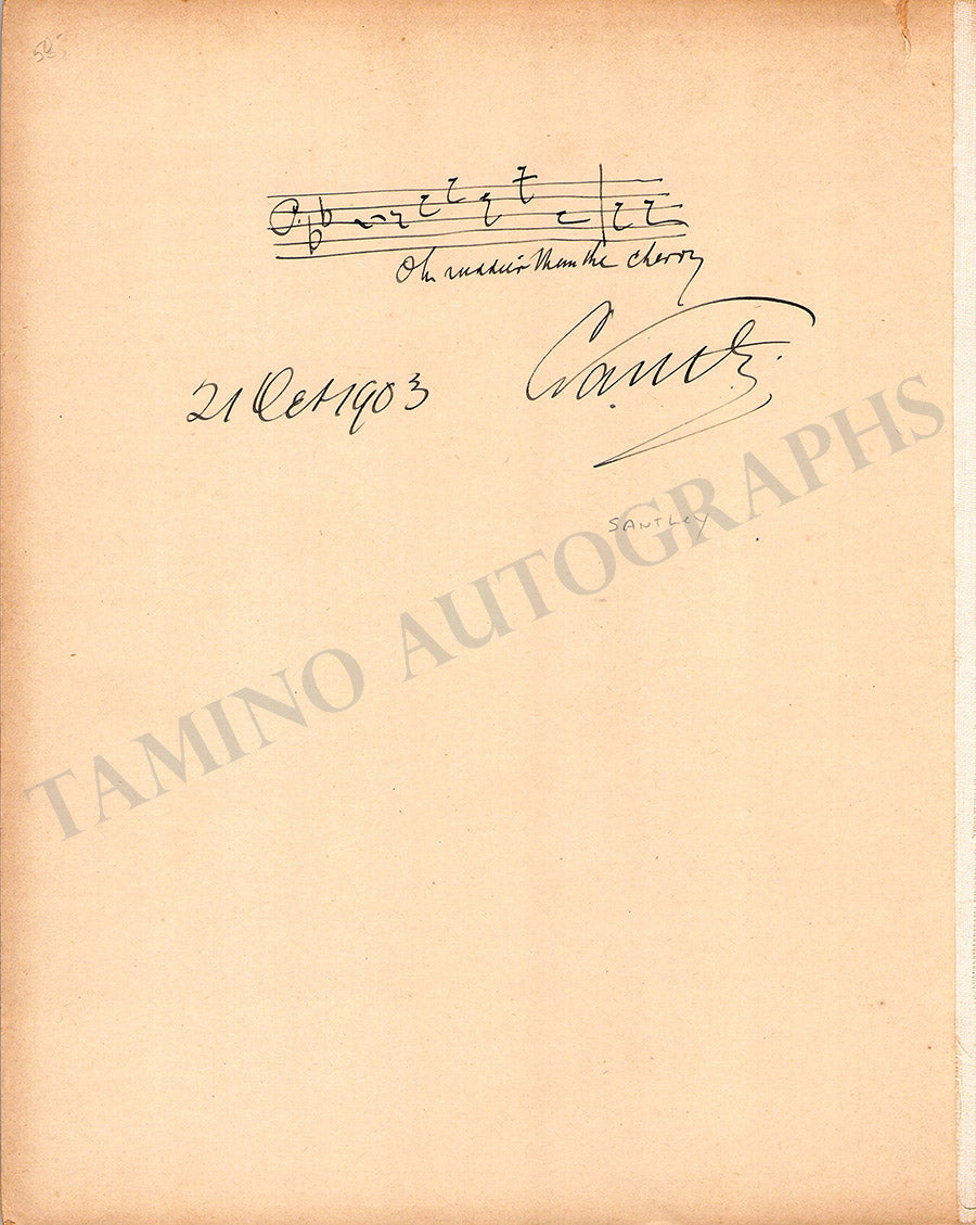2-bar autograph music quote from Haendel's opera 'Acis and Galatea' with the lyrics 'Oh ruddier than the cherry' signed by him and dated on Oct 24, 1903. Size is 8.5 x 10.6 inches, in overall excellent condition.