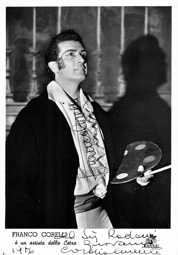 Superstar Italian tenor (1921-2003), signed photograph, shown in role (most likely Cavaradossi in Puccini's Tosca), inscribed  and dated in 1956. Stamped on verso by Morris photographers, Turin. Size is 4.25 x 6 inches, in excellent condition.