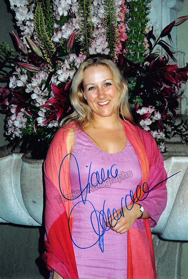 Beautiful promo color photograph signed by her. Size is 4.1 x 5.75 inches, in excellent condition.