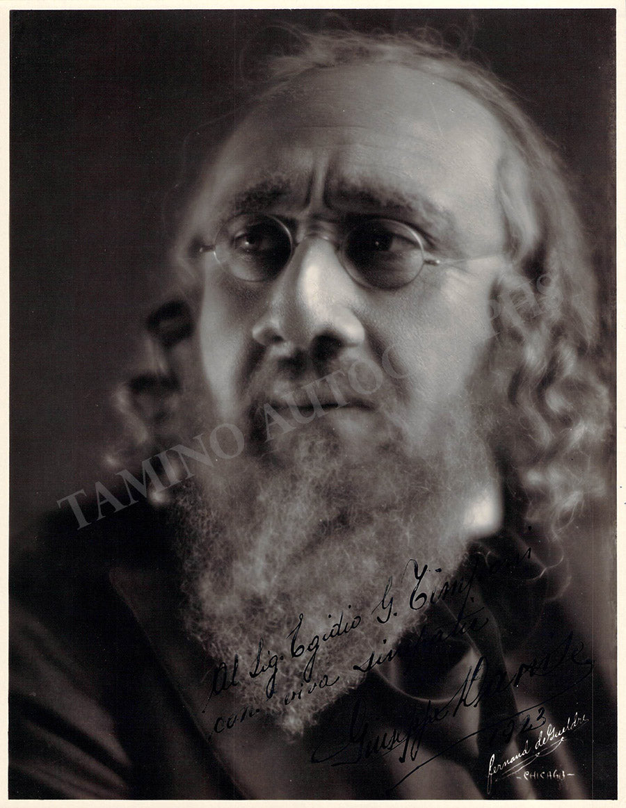 Prominent Italian baritone and later voice teacher (1882-1963), signed photograph, shown in role, inscribed and dated in 1923. Stamped on verso by photographer Fernand De Gueldre, Chicago. Size is 7.25 x 9.25 inches, in excellent condition.