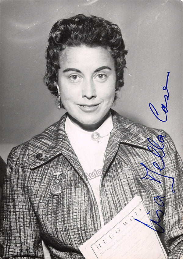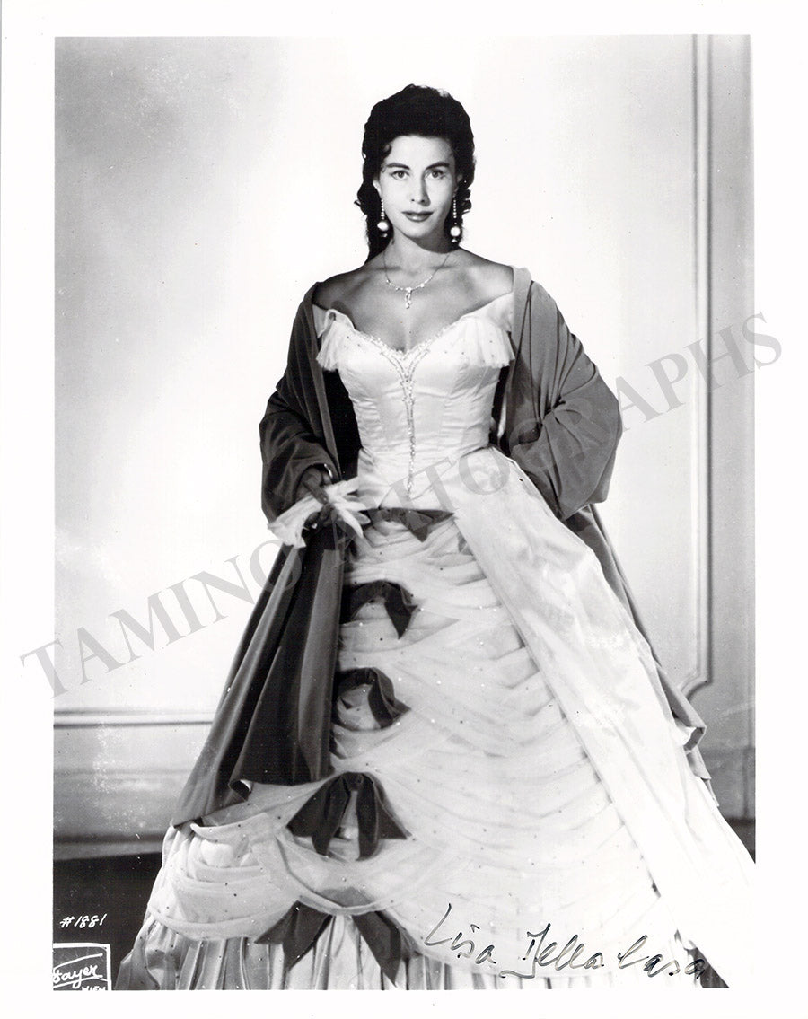 Nice black-and-white photograph signed by her, shown in costume for a performance of Strauss' opera Der Rosenkavalier at Teatro alla Scala, season 1951-1952. Size is 4 x 5.5 inches, photo by Erio Piccagliani, in excellent condition.