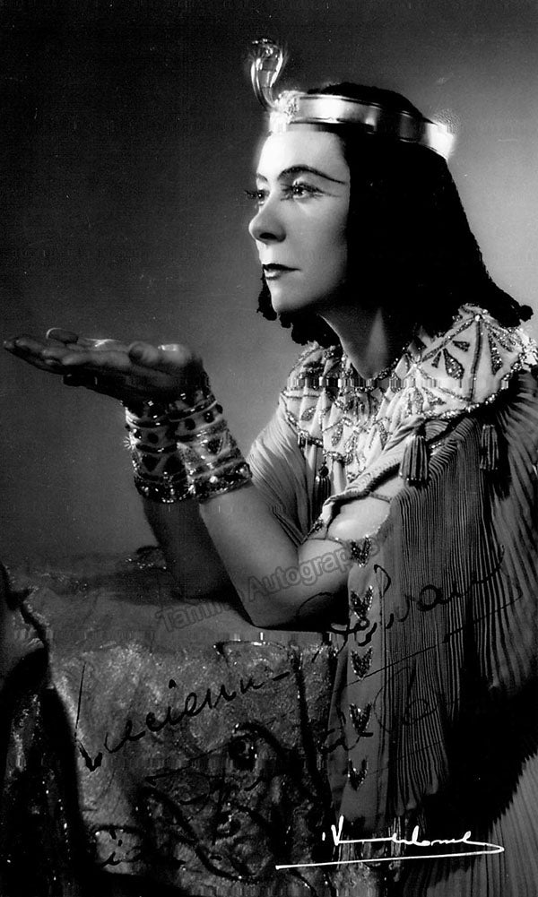 Belgian mezzo-soprano (1916-2015), signed postcard photograph, shown as Amneris in Verdi's Aida.  Stamped on verso by photographer Verhassel, Brussels. Size is 3.5 x 5.5 inches, in excellent condition.