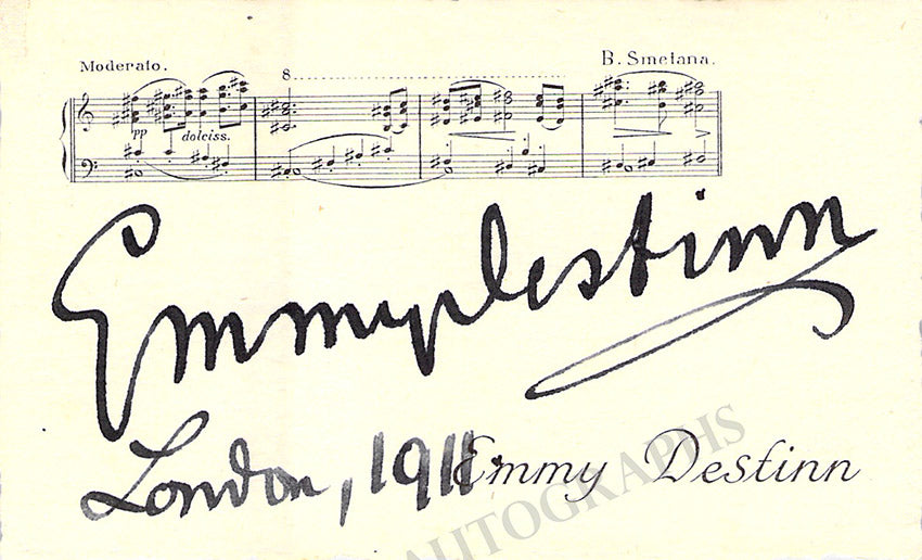 Signed business card, dated in London in 1911 with a printed musical quote of music by Smetana just above the signature. Bold signature. Size is 2.5 x 4 inches, in very good condition.