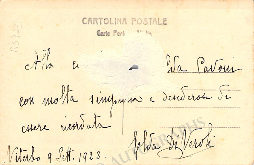 Italian soprano (1892-1981), particularly active in Italy following the First World War but whose career came to a close in 1937 because of her Jewish ancestry (was forced to remain hidden until 1943-1944). Signed postcard photograph, shown most likely in role, signed on front with additional signature and inscription on verso, dated in 1923. Size is 3.5 x 5.5 inches, some paper loss on edges, otherwise in very good condition.