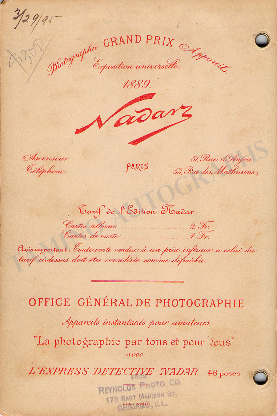 Fine vintage cabinet photograph of him by photographer Nadar (Paris) signed by him in 1895 with a short music quote. Size is 4.25 x 6.4 inches, storage holes, otherwise in very good condition.