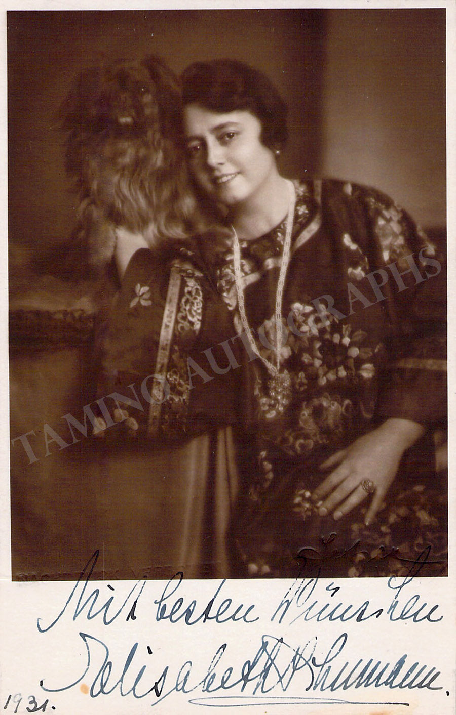 Fine sepia photo postcard signed by her in 1931, shown with her dog; ink-stamped on verso by photographer Setzer (Vienna). Size is 3.25 x 5.25 inches, in excellent condition.