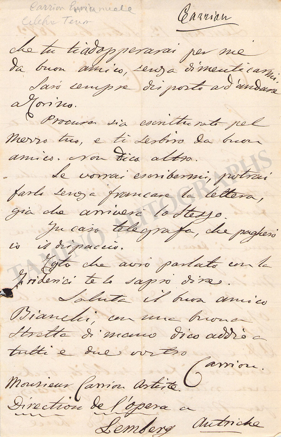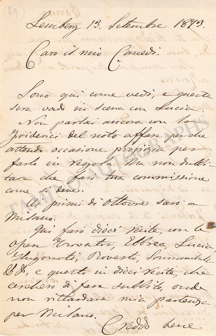 A. Lemberg 13 Settembre 1873. To the impresario Canedi: “…Sono qui come vedi, e questa sera vado in scena con Lucia. Non parlai ancora con la [Teodosia] Friderici del noto affare perché attendo occasione propizia (…) Ai primi di ottobre sarò a Milano. Qui farò dieci recite, con le opere Traviata, Ebbrea, Lucia, Ugonotti, Roberto, Sonnambula, etc…”. Size is 5.3 x 8.2 inches, 2 written page, overall age-toning, in very good condition.