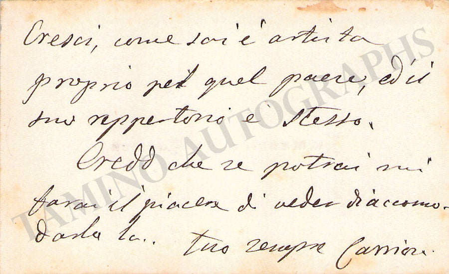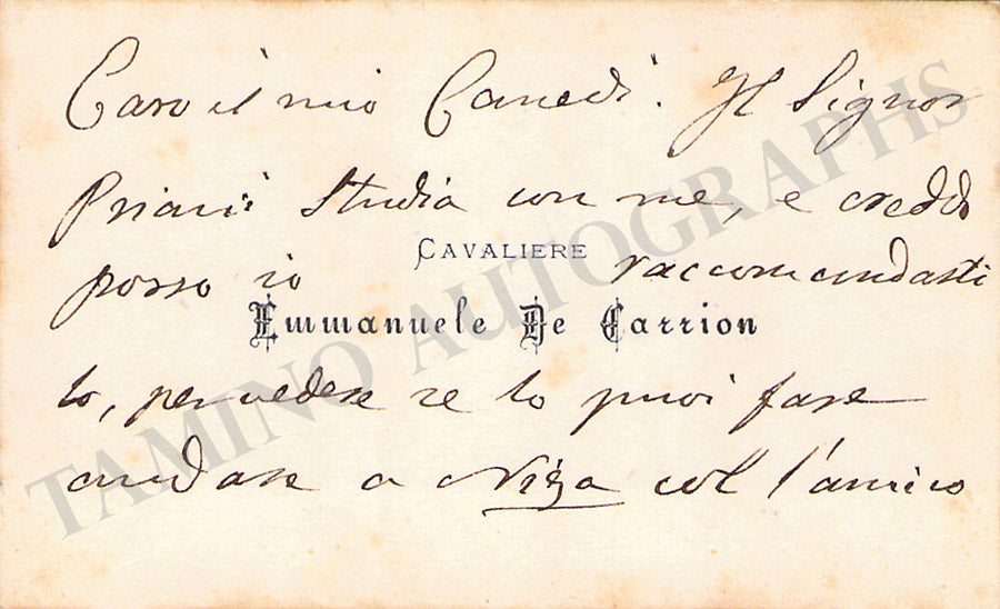 B. Short note on his business card addressed to Canedi, reccomending the bariton Ignazio Priani. Size is 3.7 x 2.2 inches, some stains, in very good condition.