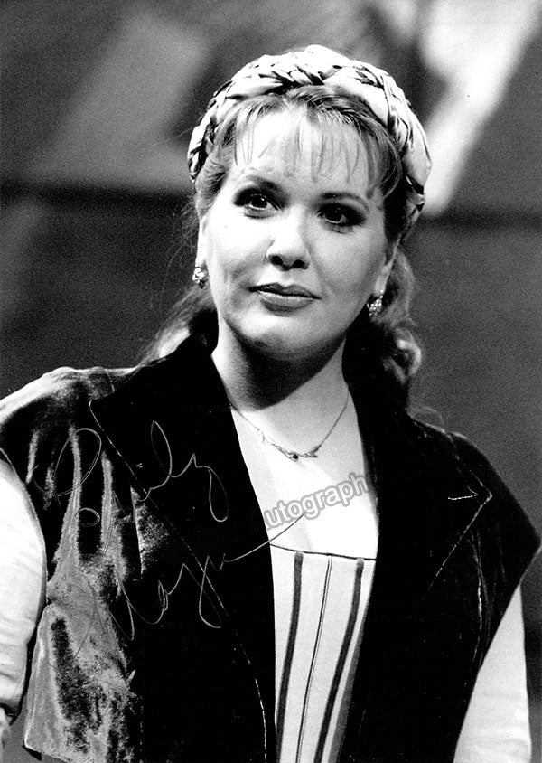 Beautiful black-and-white photograph signed by her, shown as Eva in Wagner's Die Meistersinger von Nürnberg at Bayreuth Festival, 1997. Size is 4.1 x 5.7 inches, in excellent condition.