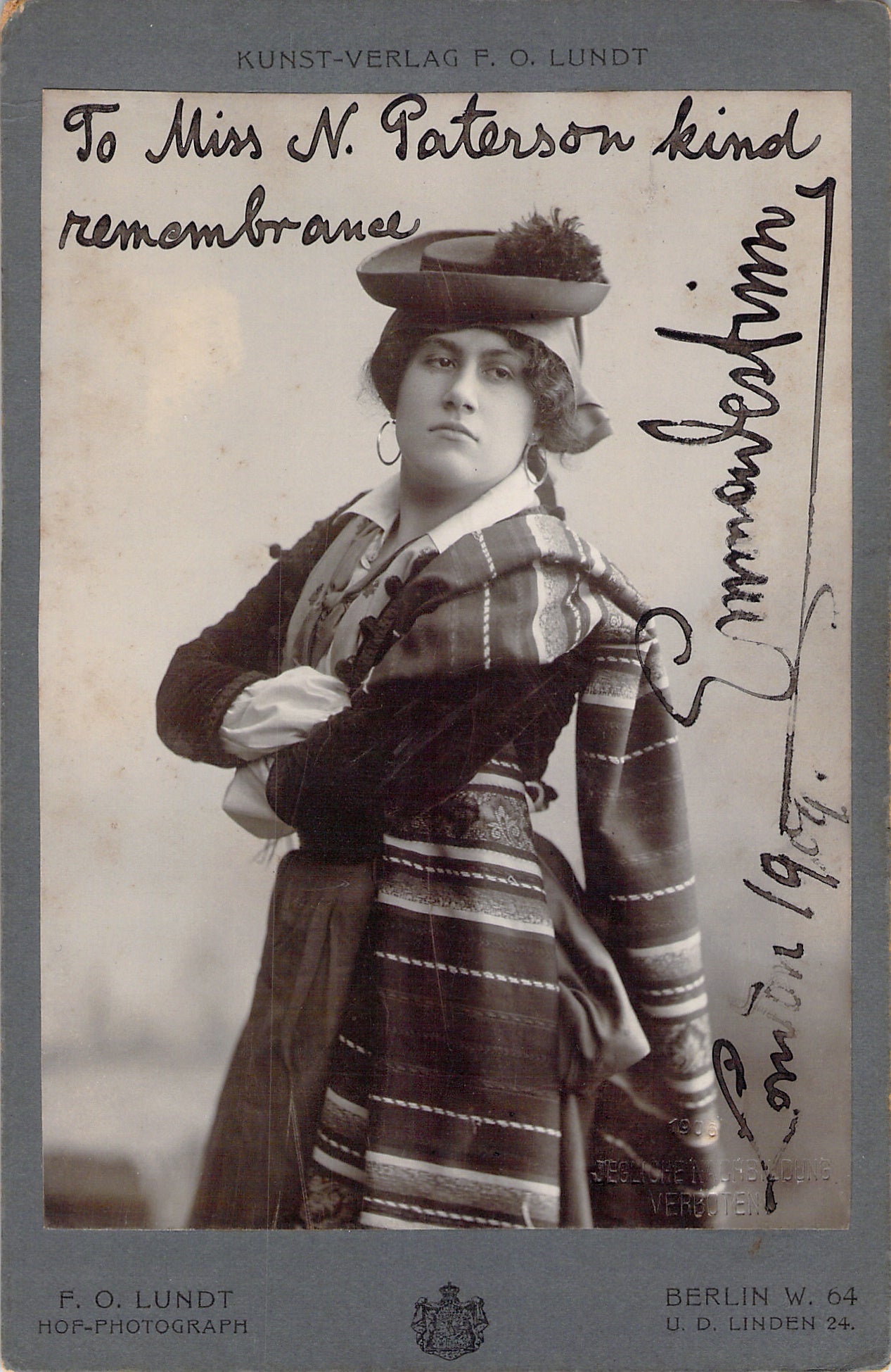 A gorgeous cabinet photograph of the artist shown in costume by photographer F.O. Lundt (Berlin) signed and inscribed by Destinn with a short sentiment dated in London, 1904. Size is 4.25 x 6.6 inches, in excellent condition.