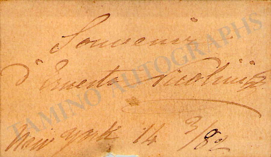 Card signed by him with a short sentiment dated in New York 1882. Size is 3.1 x 1.8 inches, a bit faded, in very good condition.