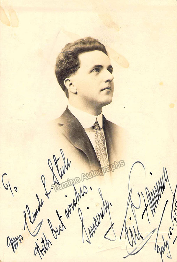 American baritone (1880-1931),  signed half-tone postcard photograph, shown as himself, inscribed and dated in 1915.  Size is 3.5 x 5 inches, small stains above the image, otherwise in very good condition.
