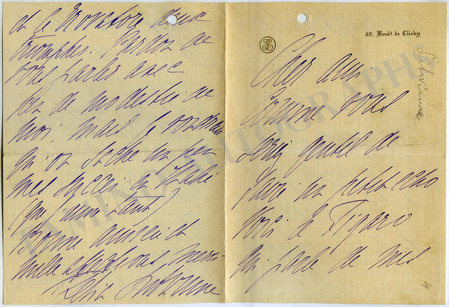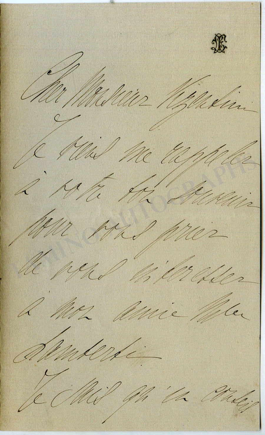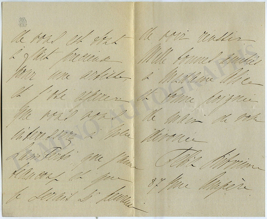 A. To the violinist Albert Vizentini (1841-1906): “…je viens me rappeler à votre bon souvenir pour vous prier de vous intéresser a mon amie M.lle Lamberti. Je sais qu’un conseil de vous est tout à fait précieux pour une article…”. 3 pp. In-8.