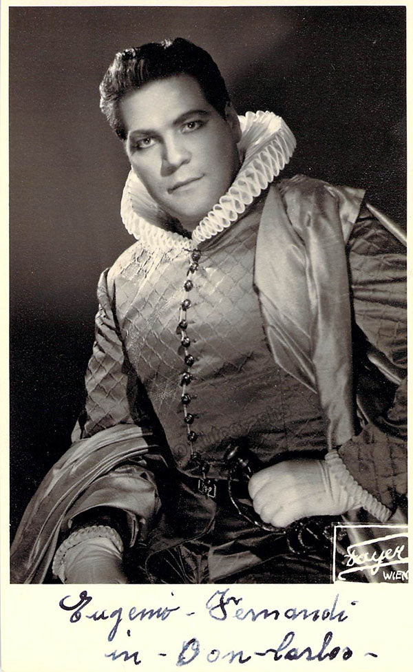 Signed photograph, shown most likely in the title role of Verdi's Don Carlo, blind stamped on front by photographer Badodi, Milan. Size is 4 x 7 inches, mounting traces on verso, otherwise in excellent condition.