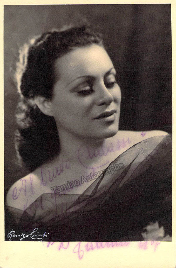 Italian soprano (1916-1998), signed photograph, shown as herself, inscribed. Hand signed on front and stamped on verso by photographer Renzo Cinti, Rome. Size is 4.5 x 7 inches, in very good condition.