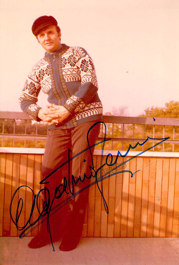 Signed publicity photograph, shown as himself, dated in 1964. Printed signature on front of photographer Villiani, Bologna. Size is 5 x 7 inches, in excellent condition.