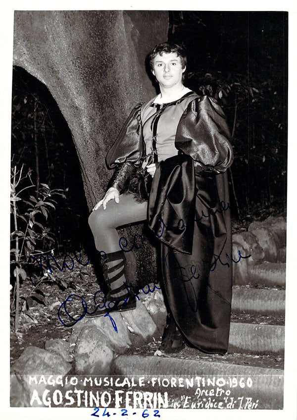 Signed photograph, shown in role in Peri's opera 'Euridice', dated in 1962. Stamped on verso by photographer Locchi, Florence. Size is 4.25 x 5.75 inches, in excellent condition.