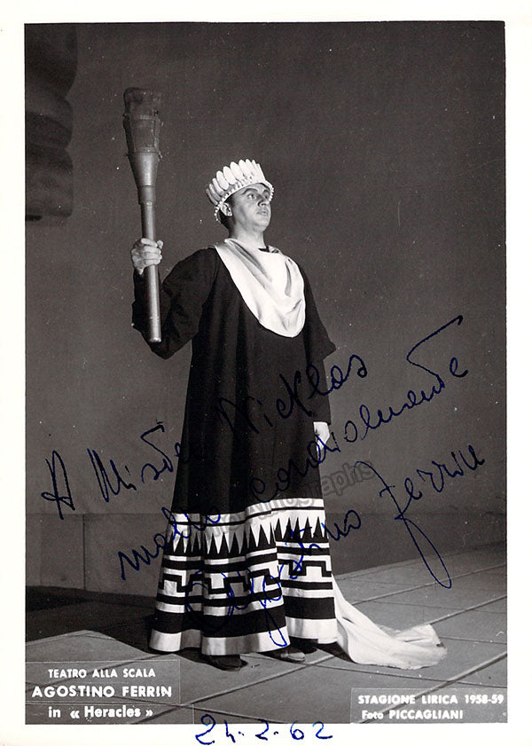 Signed photograph, shown in role in Handel's Hercules, inscribed and dated in 1962. Photo by Piccagliani, La Scala, Milan. Size is 4 x 5.75 inches, in excellent condition.