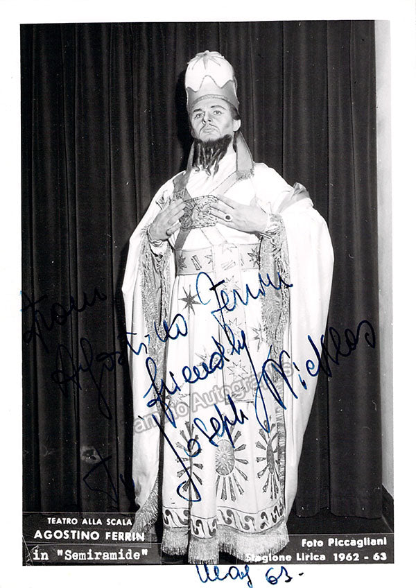 Signed photograph, shown as Assur in Rossini's Semiramide, inscribed and dated in 1963. Photo by Piccagliani, La Scala, Milan. Size is 4 x 5.75 inches, in excellent condition.